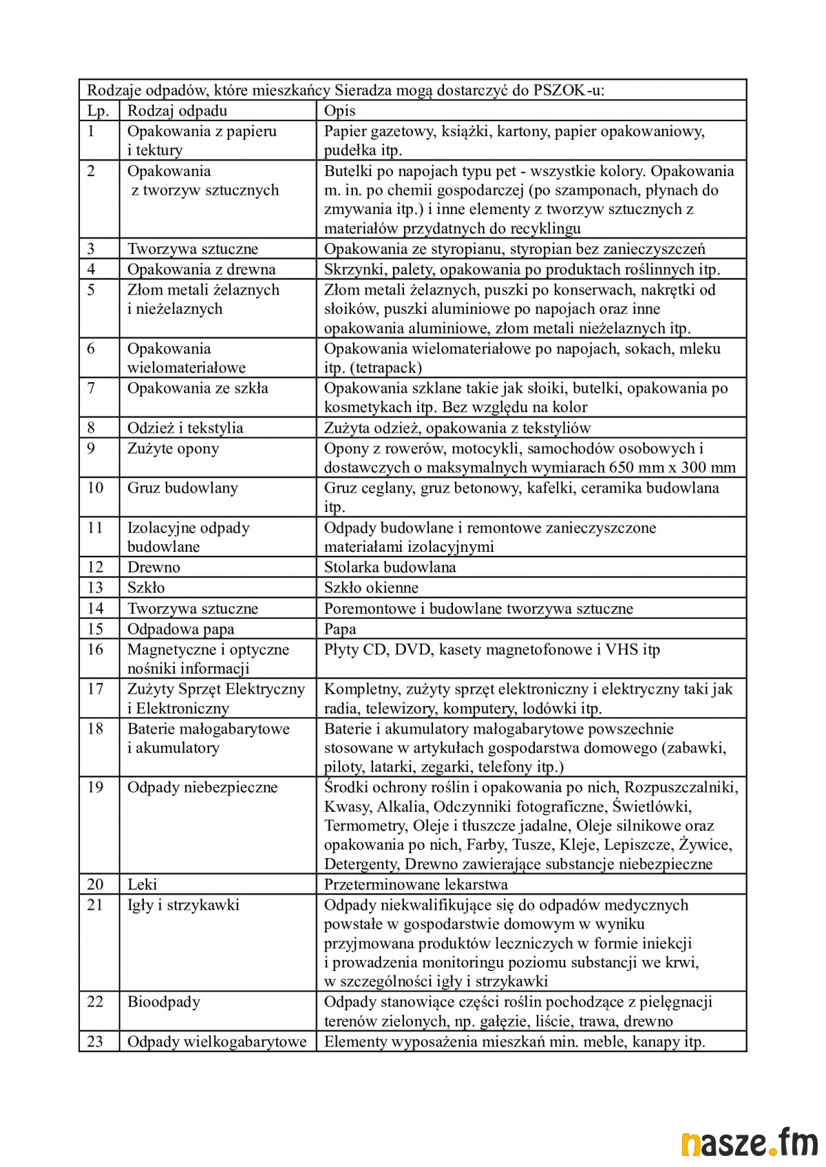 Rodzaje odpadów, które mieszkańcy Sieradza mogą dostarczyć do PSZOK-u przedstawia załączona grafika.