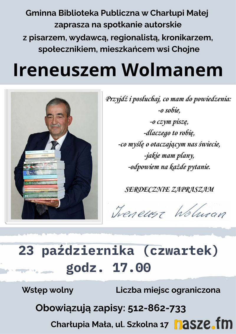 Gminna Biblioteka Publiczna w Charłupi Małej (gm. Sieradz, pow. sieradzki) zaprasza na ciekawe spotkanie autorskie. Gościem książnicy będzie Ireneusz Wolman, pisarz, kronikarz i wydawca wywodzący się z msc. Chojne w tejże gminie.