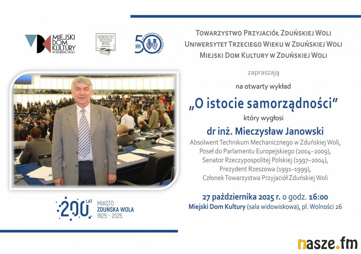 Towarzystwo Przyjaciół Zduńskiej Woli, Uniwersytet Trzeciego Wieku w Zduńskiej Woli oraz Miejski Dom Kultury zapraszają mieszkańców na otwarty wykład pt. "O istocie samorządności", który wygłosi dr inż. Mieczysław Janowski.