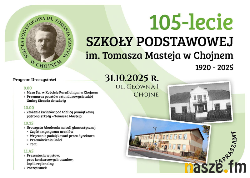 Szkoła Podstawowa w Chojnem, to gmina Sieradz, zaakcentuje niebawem swe 105-lecie. Oficjalne obchody jubileuszu zaplanowano w piątek 31.10.br.