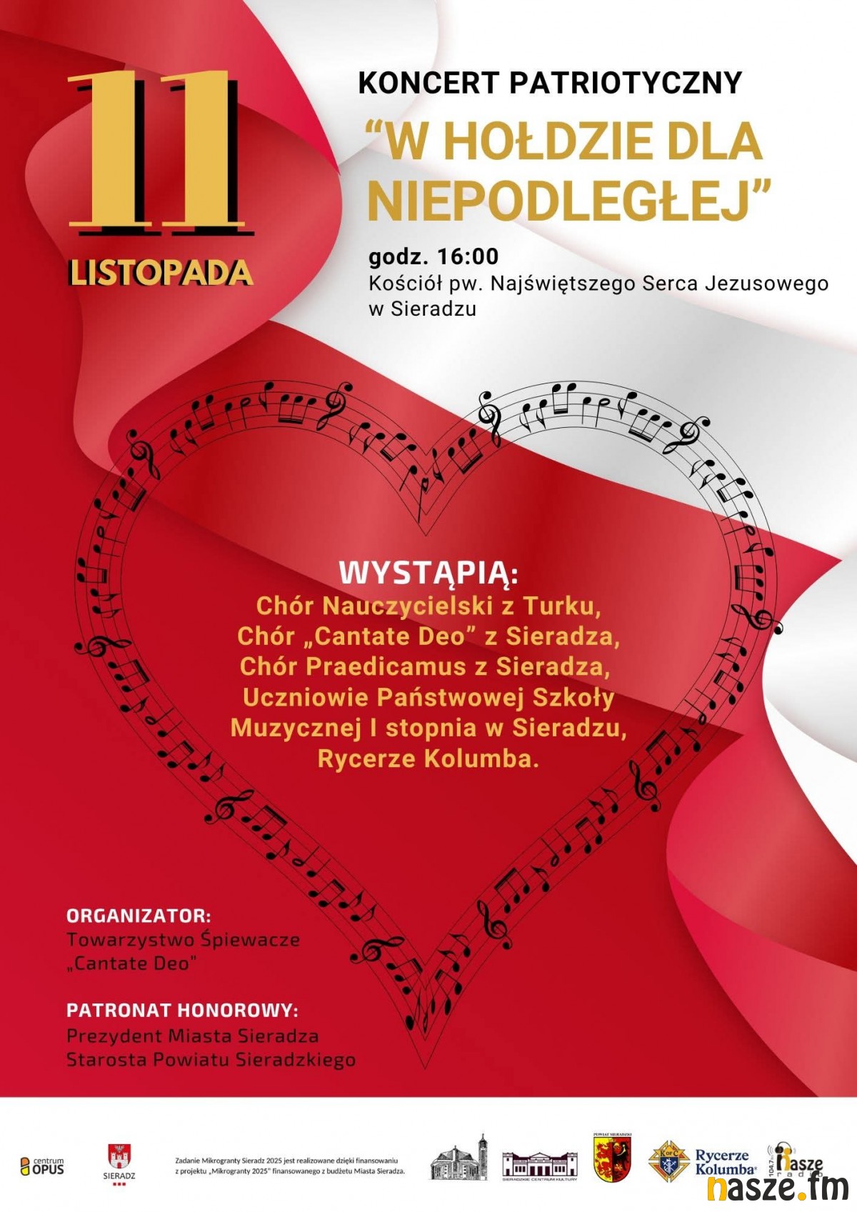 W repertuarze pojawią się zarówno znane i lubiane pieśni, m.in. "O mój rozmarynie", "Do polskiego wojska", "Rozkwitają pąki białych róż" czy "Modlitwę o pokój", jak i perełkę muzyki renesansowej - utwór Wacława z Szamotuł "Błogosławiony człowiek". Zwieńczeniem koncertu stanie się wspólne wykonanie Roty i Gaude Mater Polonia - już tradycyjny moment muzycznej jedności wszystkich wykonawców i publiczności. Koncert odbywa się pod honorowym patronatem Prezydenta Miasta Sieradza oraz Starosty Powiatu Sieradzkiego, a patronat medialny objęło Nasze Radio. Wstęp na wydarzenie jest bezpłatny. Projekt został dofinansowany ze środków Lokalnego Programu Mikrograntów "Mikrogranty 2025", finansowanego z budżetu Miasta Sieradza. - Zapraszamy całe rodziny do wspólnego świętowania Niepodległości w atmosferze muzyki, wzruszeń i dumy narodowej. Niech ten koncert stanie się pięknym dopełnieniem sieradzkich obchodów 11 listopada i wspólnym śpiewem serc dla Niepodległej - zapraszają chórzyści z Cantate Deo.