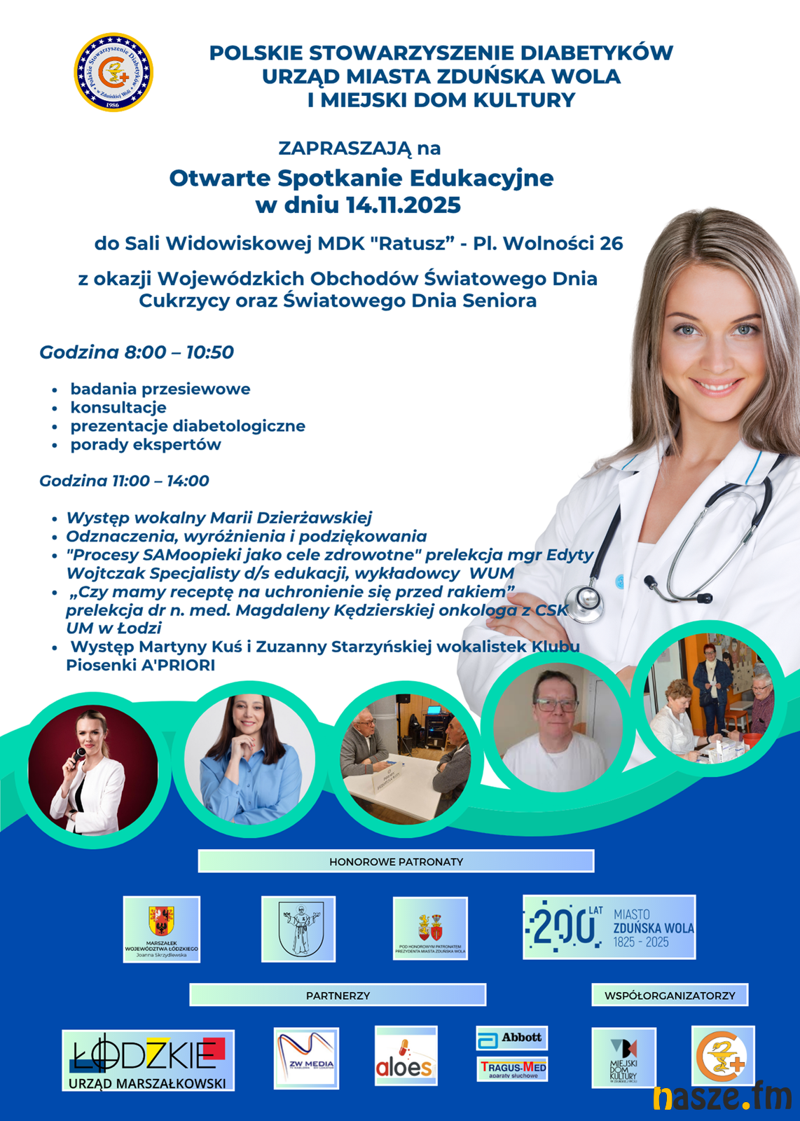 Na wydarzenia zapraszają: Polskie Stowarzyszenie Diabetyków, Urząd Miasta Zduńska Wola i Miejski Dom Kultury Ratusz w Zduńskiej Woli.