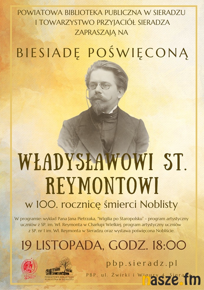 Powiatowa Biblioteka Publiczna w Sieradzu oraz Towarzystwo Przyjaciół Sieradza serdecznie zapraszają dziś na spotkanie poświęcone 100. rocznicy śmierci laureata Nagrody Nobla - Władysława Stanisława Reymonta.
