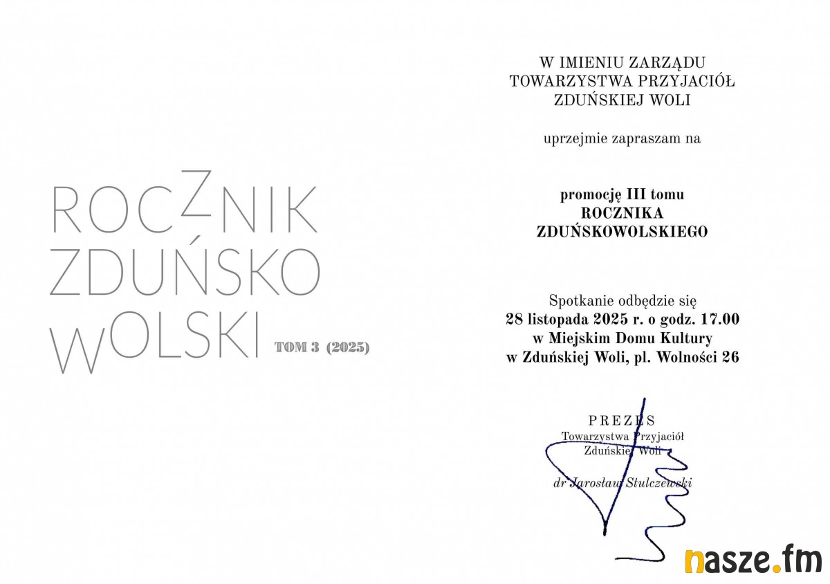 Na piątek, 28 listopada, zaplanowana została promocja nowego wydawnictwa Towarzystwa Przyjaciół Zduńskiej Woli. Zaprezentowany zostanie III. tom "Rocznika Zduńskowolskiego".