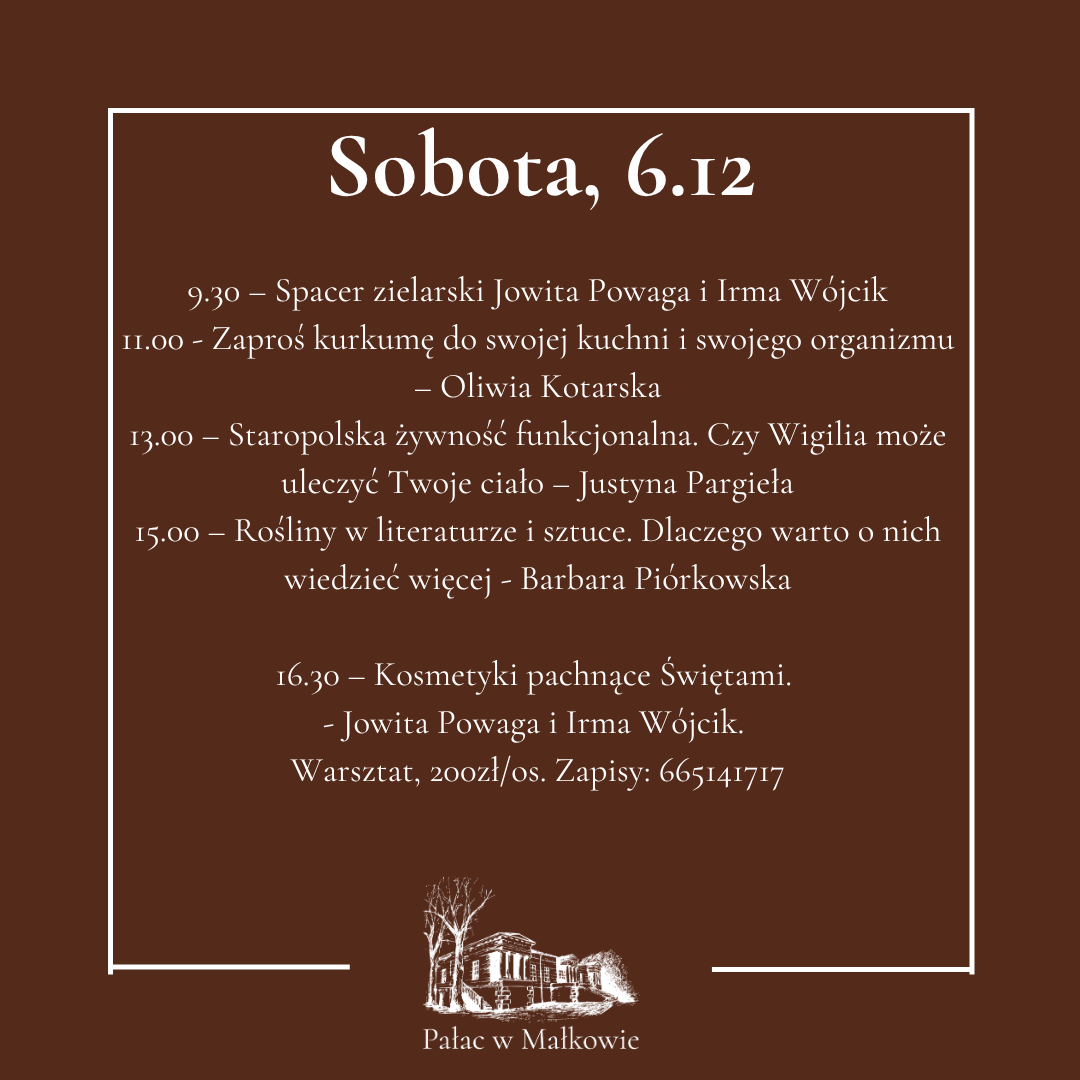 - Serdecznie zapraszam na kolejną odsłonę "Spotkania ze zdrowiem". Tym razem będzie to edycja zimowa, już około świąteczna. Będą wykłady, będzie kiermasz. A same wykłady to będzie ogrom wiedzy o zdrowiu, naturoterapii, o emocjach. Zaczniemy w piątek warsztatem tonizującym emocje związane ze świętami z Justyną Pargieła, a zakończymy warsztatem magicznych wianków świątecznych - zapowiada Agnieszka Kudlik-Budzińska, właścicielka pałacu w Małkowie.