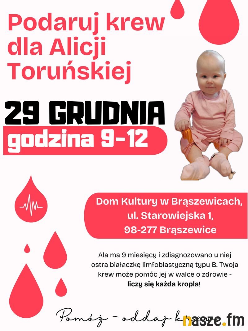 Dlatego 29 grudnia w godzinach 9-12 w Domu Kultury w Brąszewicach odbędzie się zbiórka krwi dla dziewczynki. Każdy dawca będzie mile widziany. Organizatorzy akcji z góry dziękują za wsparcie!