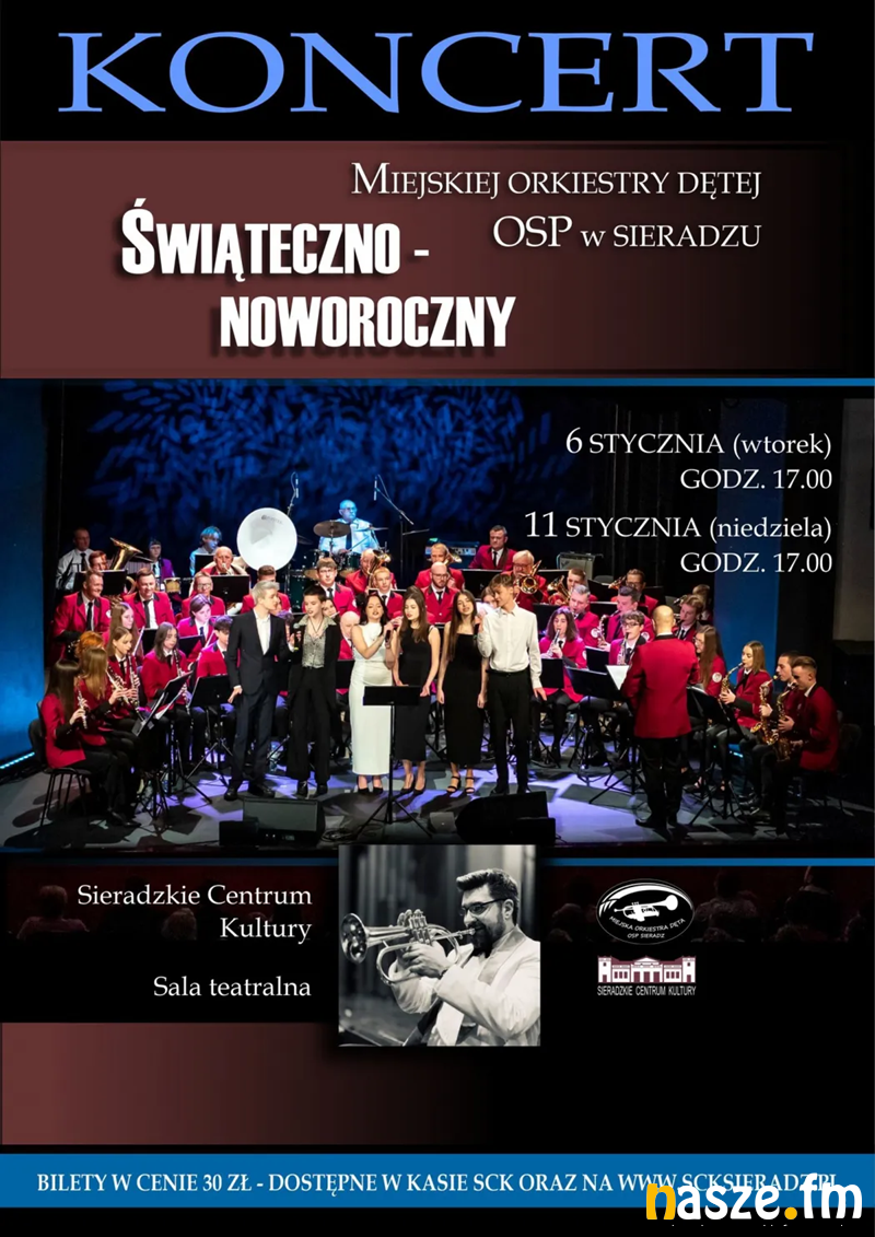 Miejska Orkiestra Dęta OSP w Sieradzu zaprasza na koncerty świąteczno-noworoczne, które odbędą się w Teatrze Miejskim w Sieradzu. Wydarzenia zaplanowano na 6 stycznia 2026 r. (wtorek) oraz 11 stycznia 2026 r. (niedziela). Oba koncerty rozpoczną się o godz. 17:00.