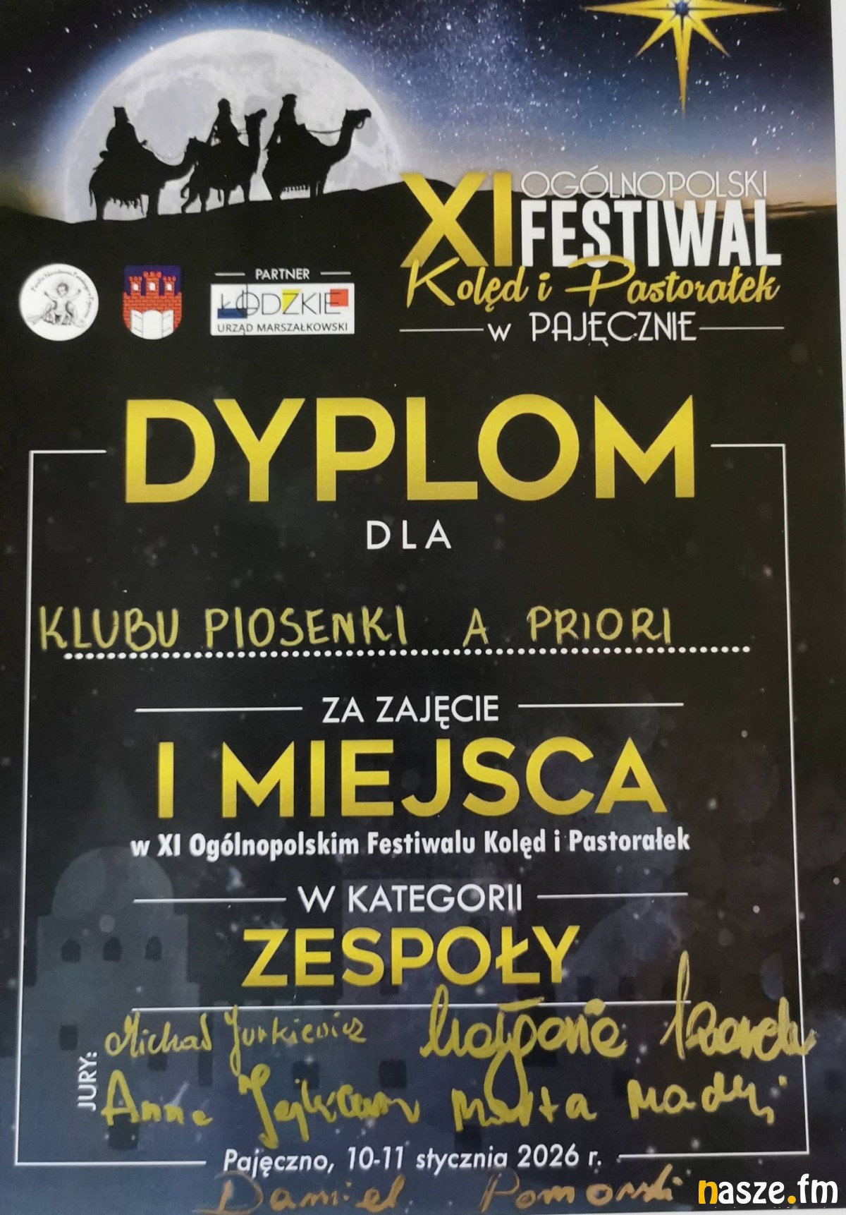 Kolejne sukcesy wokalistów z Miejskiego Domu Kultury Ratusz w Zduńskiej Woli. Klub Piosenki "A Priori" zdobył pierwszą nagrodę na XI Ogólnopolskim Festiwalu Kolęd i Pastorałek w Pajęcznie.