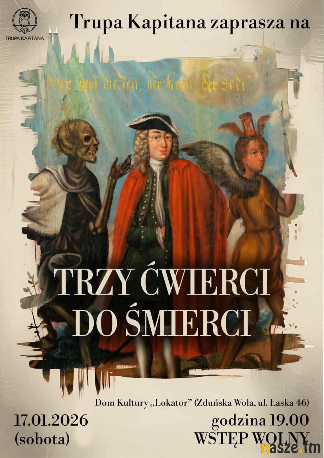 "Trzy ćwierci do śmierci" - spektakl pod takim tytułem będzie można zobaczyć jutro, 17 stycznia, w Domu Kultury Lokator w Zduńskiej Woli. Sztukę przygotowała amatorska grupa teatralna o nazwie Trupa Kapitana.