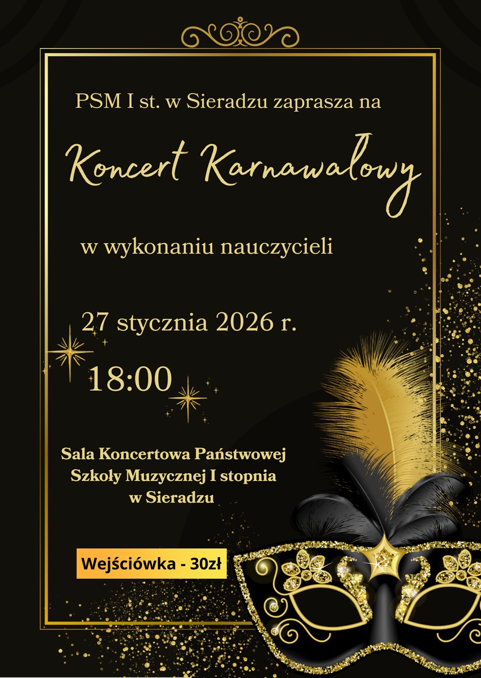 - Koncert Karnawałowy Nauczycieli, 27.01. , godz. 18:00 / Sala Koncertowa szkoły ( wejściówki w cenie 30 zł dostępne w sekretariacie szkoły).
