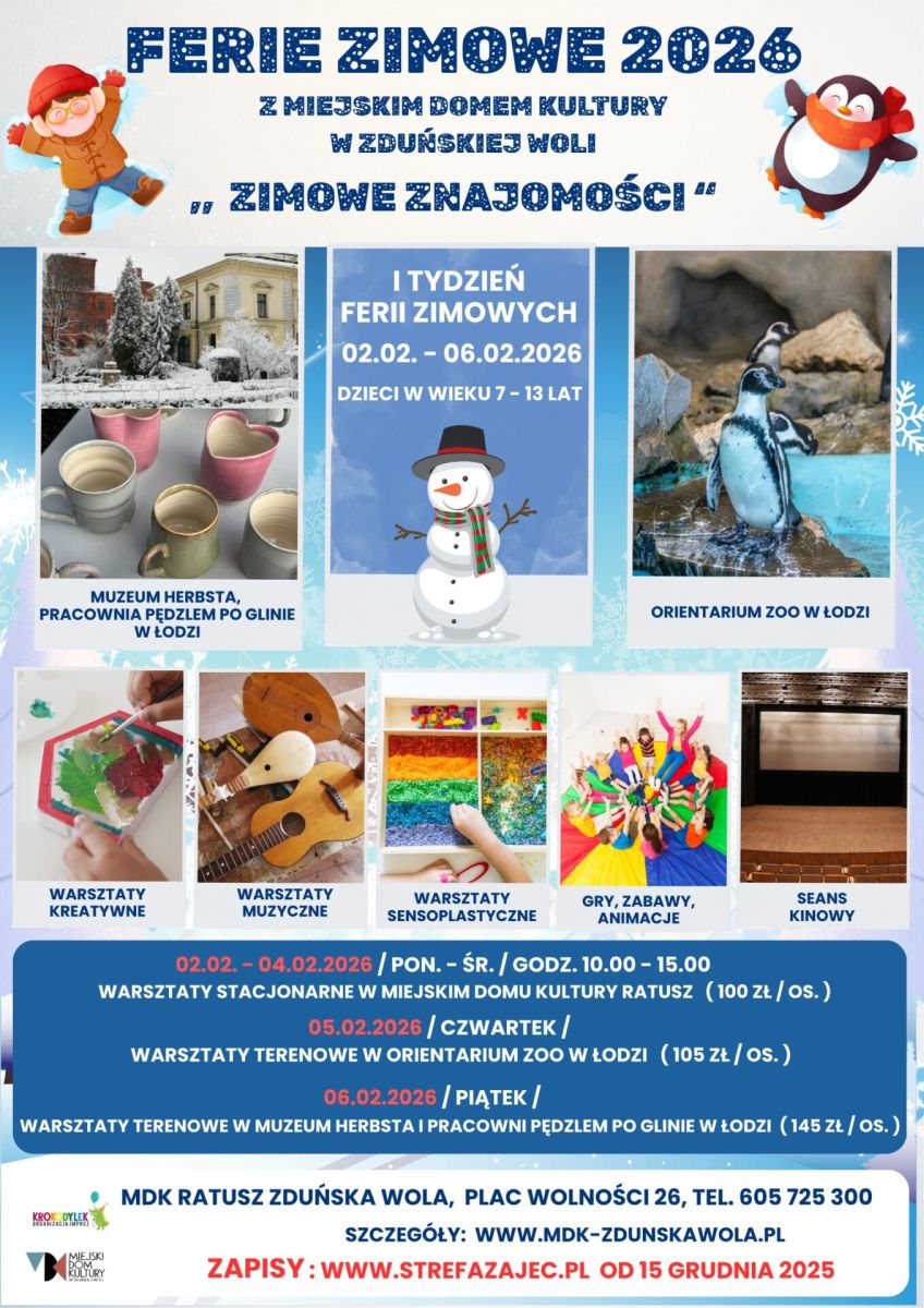 Zbliżające się ferie zimowe to czas, na który dzieci i młodzież czekają z niecierpliwością. Dla rodziców to z kolei moment poszukiwania ciekawych i bezpiecznych form spędzania wolnego czasu przez najmłodszych. Jak co roku, także w Zduńskiej Woli i Sieradzu lokalne placówki przygotowały bogatą ofertę feryjną, obejmującą zajęcia artystyczne i edukacyjne.
