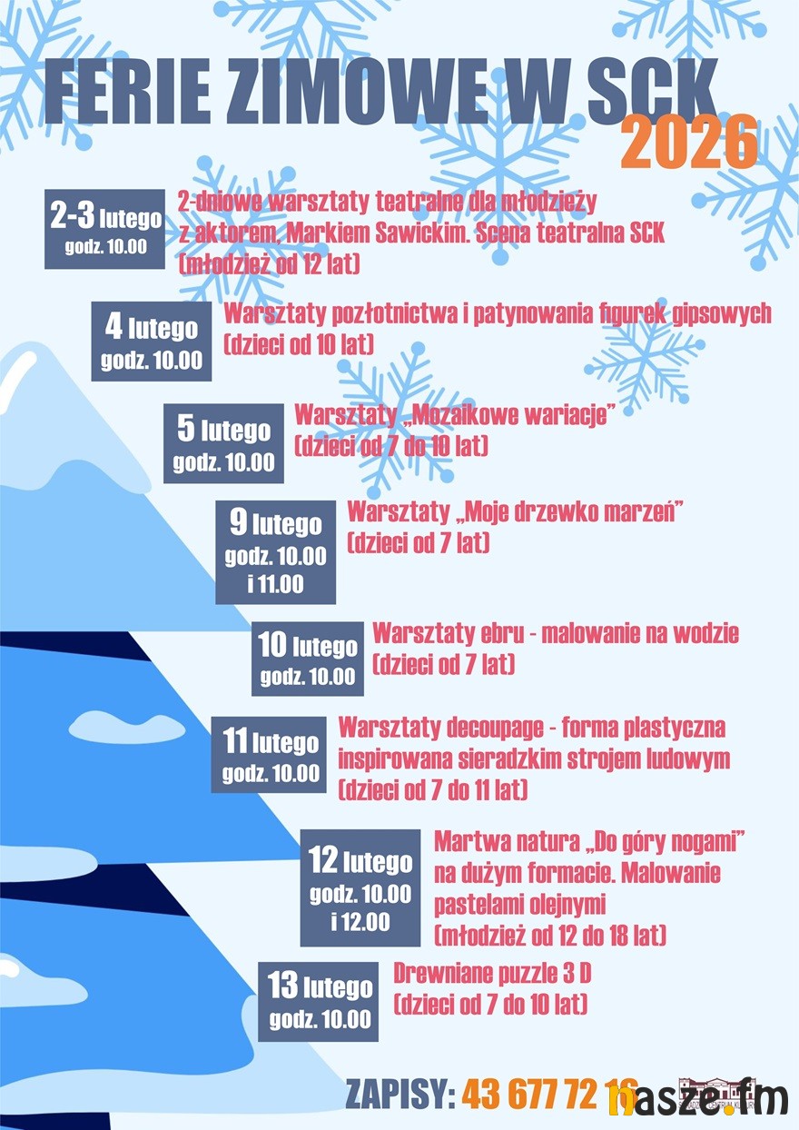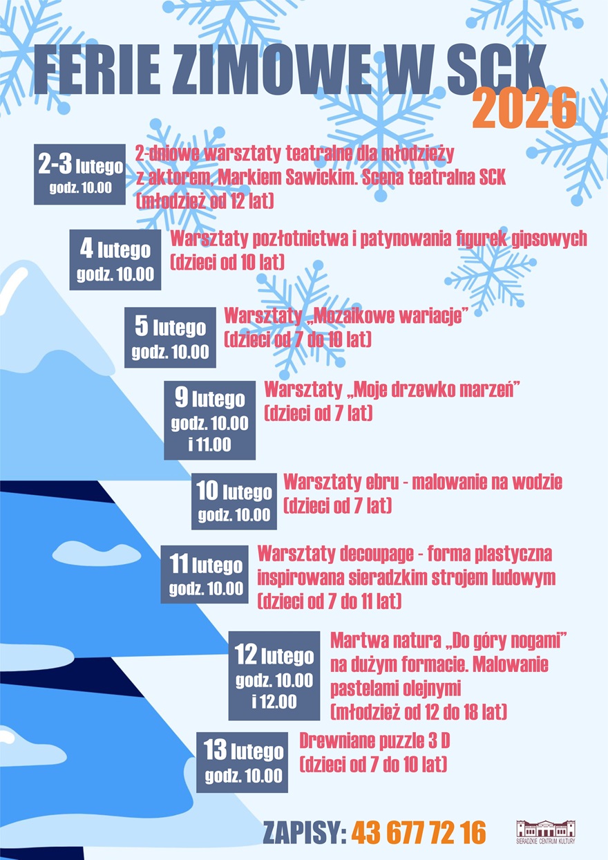 Placówka zaprasza dzieci od 6 do 12 lat na Kreatywne Feriowisko. Zajęcia rozpoczną się 9 lutego i potrwają do 13 lutego. Informacje i zapisy w biurze Spółdzielczego Domu Kultury lub pod nr tel: 43 827 16 20.