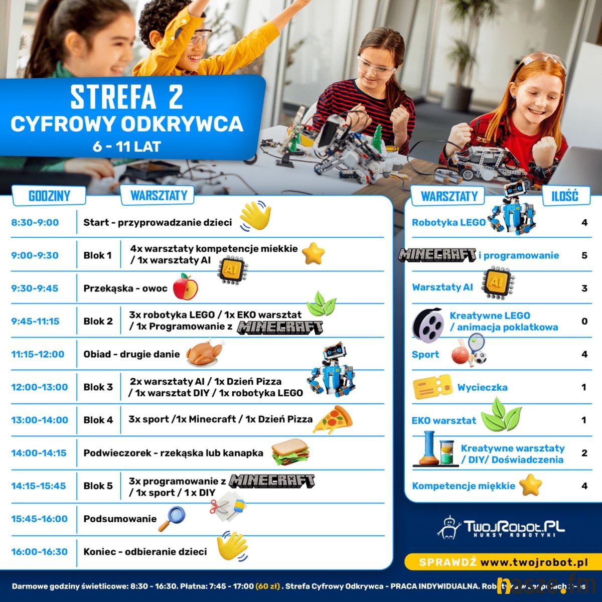 W Centrum zaplanowano zajęcia dla dzieci i młodzieży. W tym roku organizatorzy przygotowali więcej zajęć dla różnych grup wiekowych i o zróżnicowanej tematyce. Udział w zajęciach jest bezpłatny, ale trzeba się na nie wcześniej zapisać, można to zrobić dzwoniąc pod numer 43 677 72 16. Szczegóły na plakacie poniżej.
