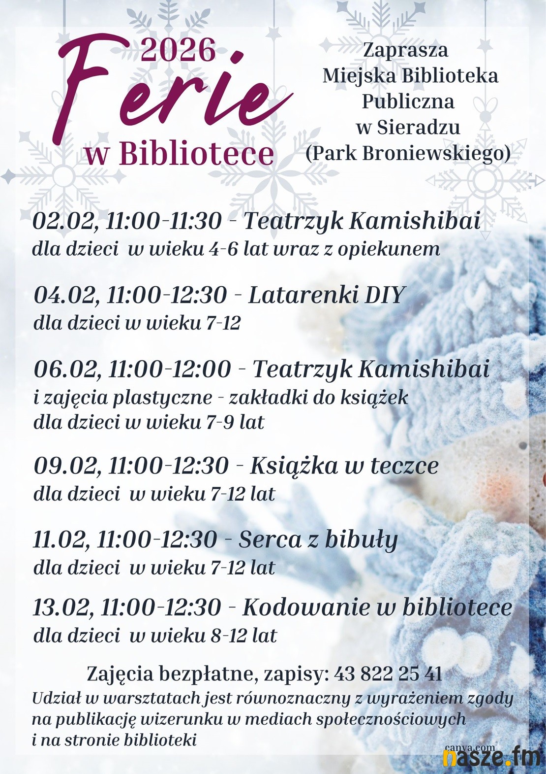 Równie atrakcyjnie zapowiadają się ferie w Sieradzu. Tamtejsze instytucje kultury i sportu przygotowały programy łączące zabawę z nauką. W planach są m.in. warsztaty rękodzielnicze, zajęcia edukacyjne, seanse filmowe oraz spotkania z ciekawymi gośćmi.