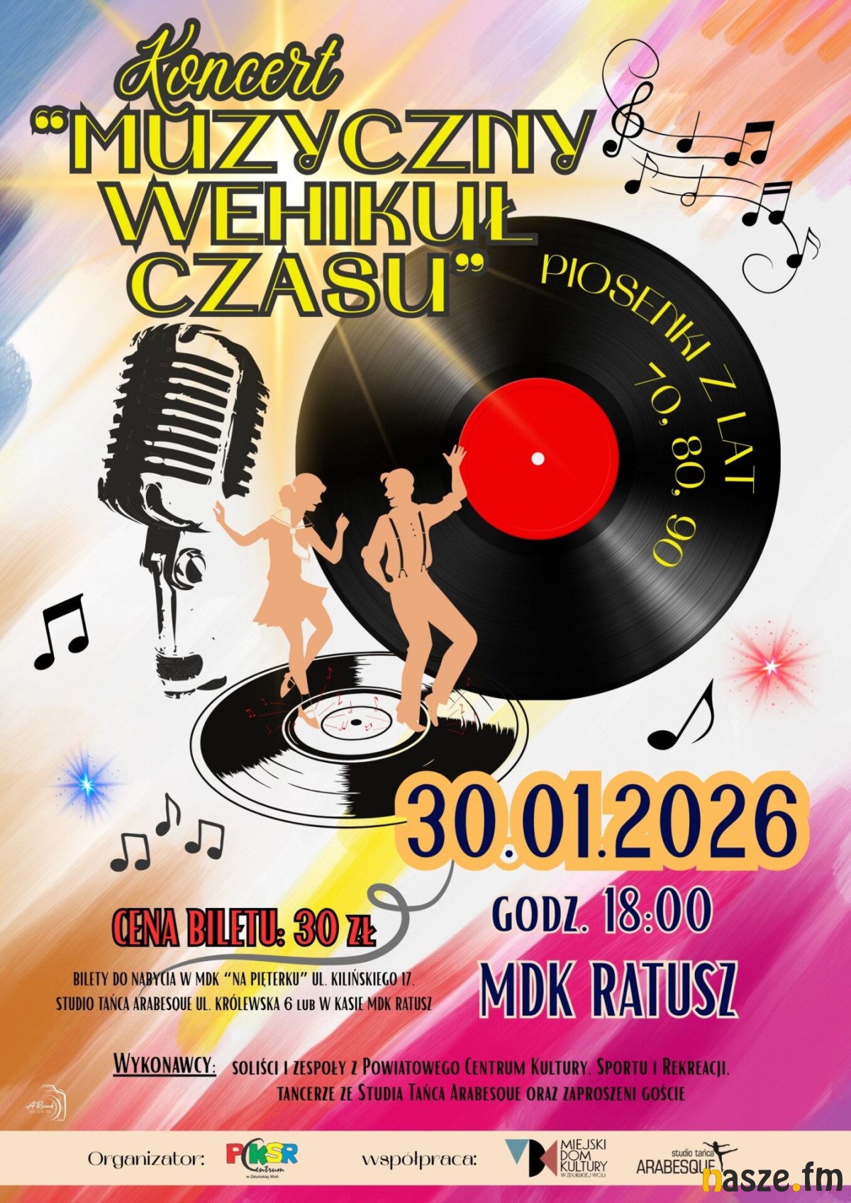 Piosenki z lat '70, '80, '90 ubiegłego wieku. Wielkie przeboje i mniej znane utwory polskich i zagranicznych wykonawców w klasycznych i nowoczesnych aranżacjach. Miejski Dom Kultury Ratusz w Zduńskiej Woli zaprasza na koncert "Muzyczny wehikuł czasu".