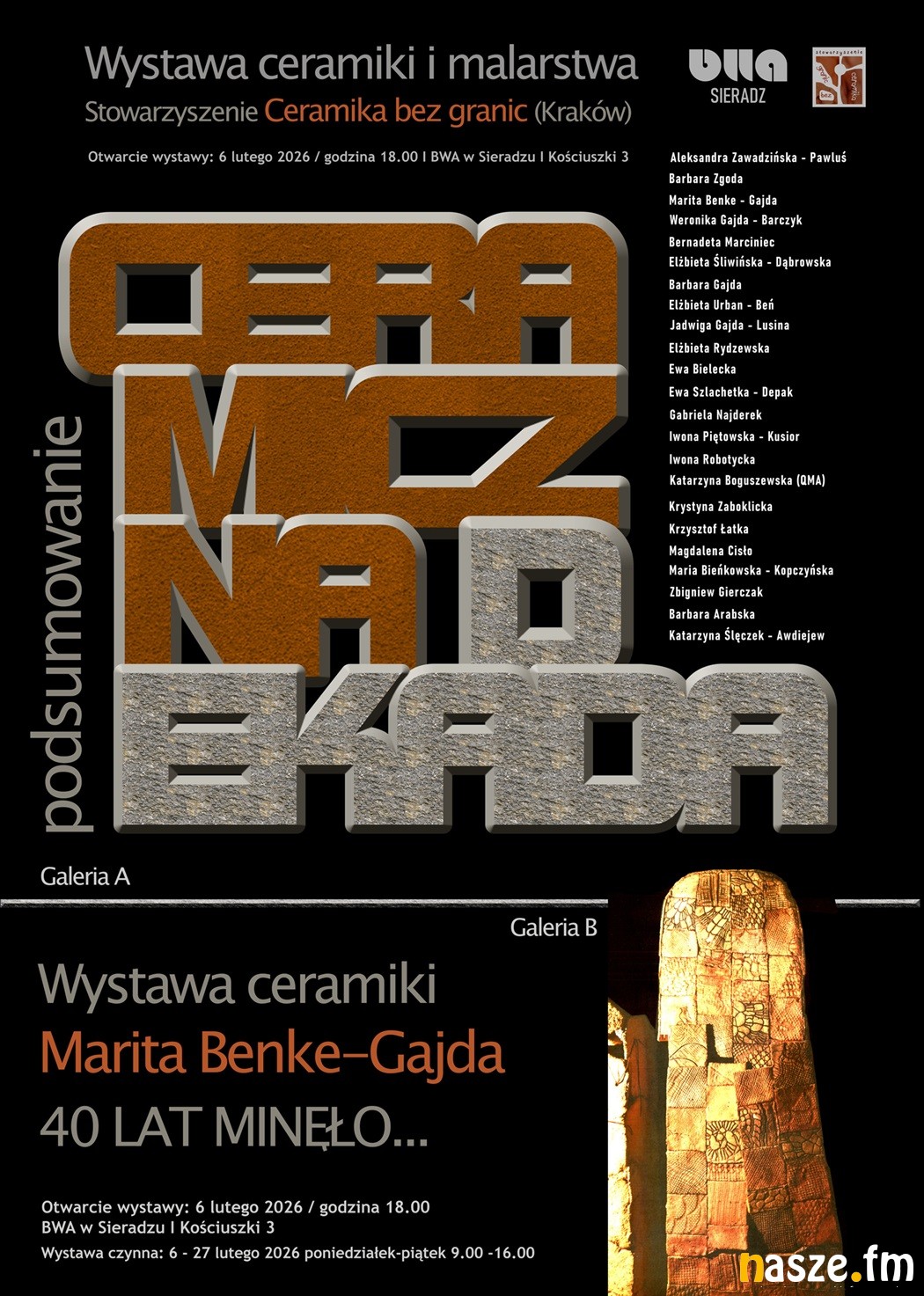 Na jednej z nich zobaczymy prace ponad dwudziestu artystów ze Stowarzyszenia "Ceramika bez granic" z Krakowa. To wystawa ceramiki i malarstwa, która będzie prezentowana w Galerii A i jest zatytułowana "Ceramiczna dekada - podsumowanie". Z kolei w Galerii B swoje prace pokaże Marita Benke-Gajda na ekspozycji "40 lat minęło..."