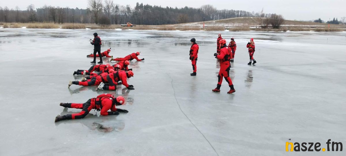 - Pierwszy scenariusz to akcja z tak zwanym sprzętem przygodnym. Mówimy tutaj o sankach, mówimy tutaj o jakichś długich elementach w postaci liny, sznura, czyli wszystkie te rzeczy, które przygodne osoby przebywające nad zbiornikami, mogą wykorzystać do udzielenia pomocy. Drugi scenariusz to już typowy ratownik. Ratownik ubrany w odpowiedni sprzęt, w kask, w suchy skafander, w kolce do przemieszczania się po lodzie, musi w odpowiedni sposób dotrzeć do poszkodowanego, opanować, wpiąć go w pas ratowniczy typu węgorz i przez kolejnego ratownika jest holowany na brzeg. Trzecia procedura z użyciem deski ortopedycznej, gdzie deska zmniejsza nam nacisk punktowy na lód i ratownik przez przesuwanie deski przesuwa się po tym lodzie i dociera do poszkodowanego - wyjaśnia Patryk Sokal.