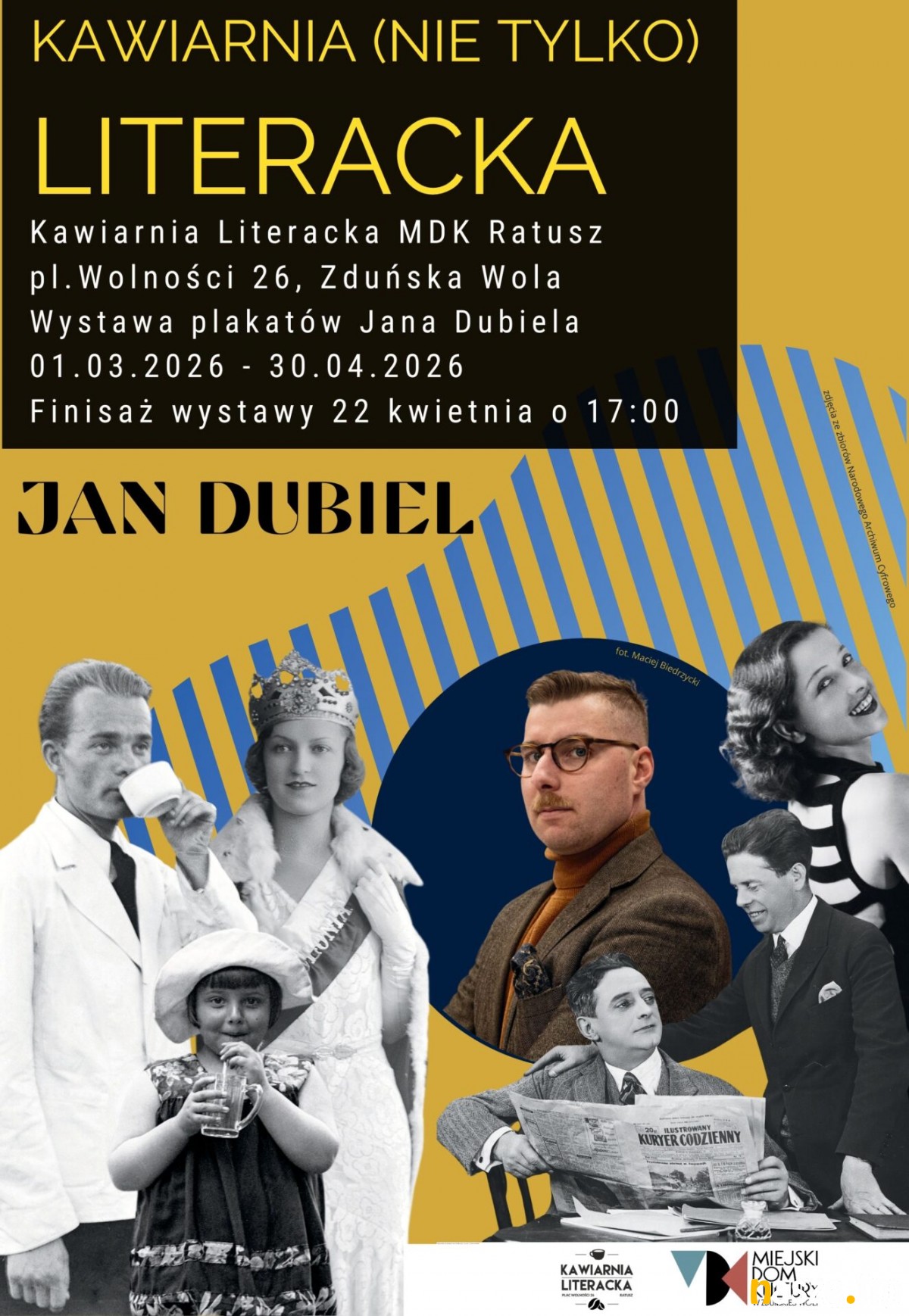 Lekkie w odbiorze plakaty, wykorzystujące archiwalne fotografie i skupione wokół postaci, będą tematem kolejnej wystawy w Kawiarni Literackiej Miejskiego Domu Kultury Ratusz w Zduńskiej Woli. Swoje prace pokaże Jan Dubiel.