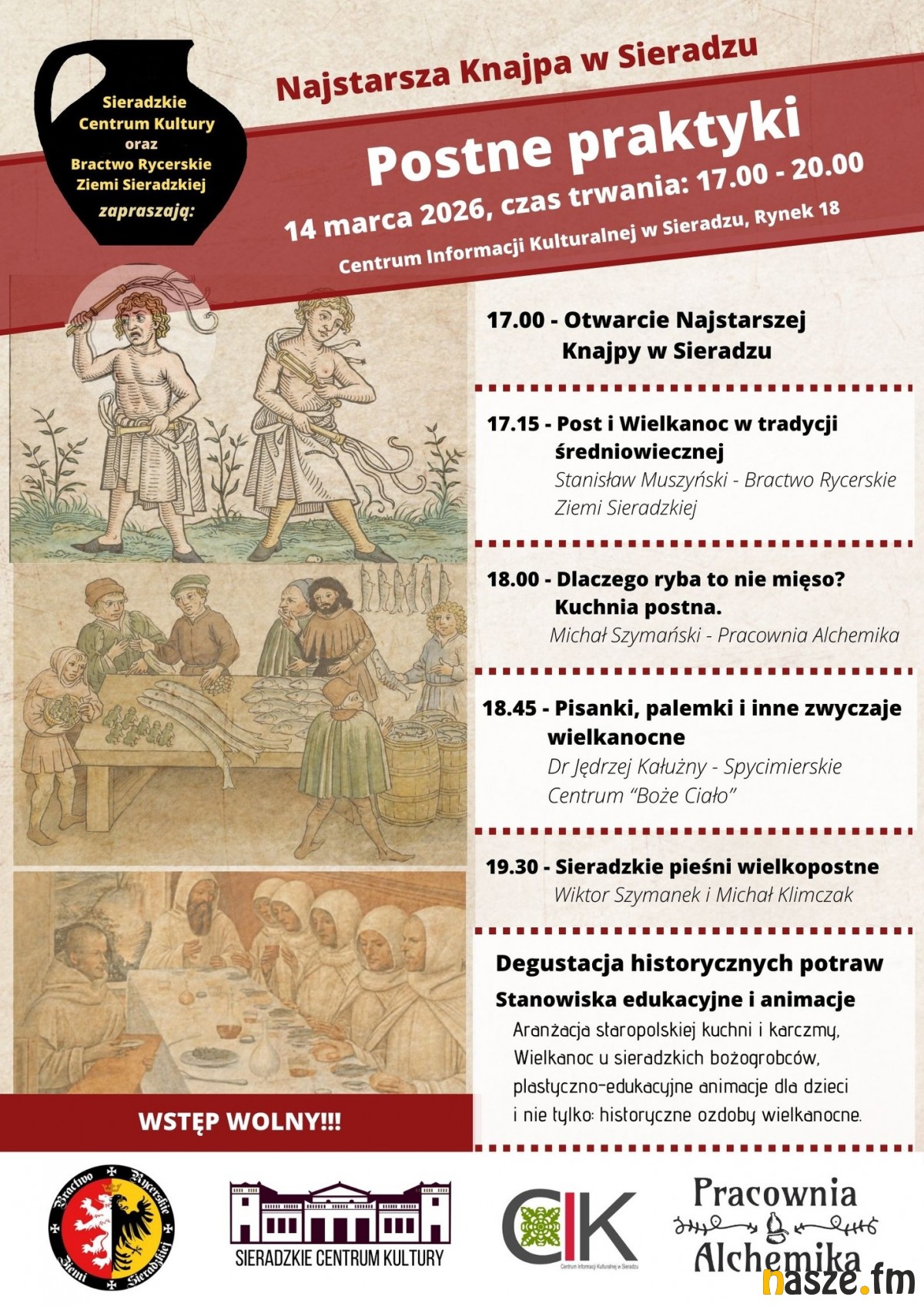 Centrum Informacji Kulturalnej w Sieradzu wspólnie z Bractwem Rycerskim Ziemi Sieradzkiej zapraszają w najbliższą sobotę, 14 marca, na kolejną odsłonę Najstarszej Knajpy w Sieradzu. Tym razem hasło przewodnie wydarzenia to: Postne Praktyki.