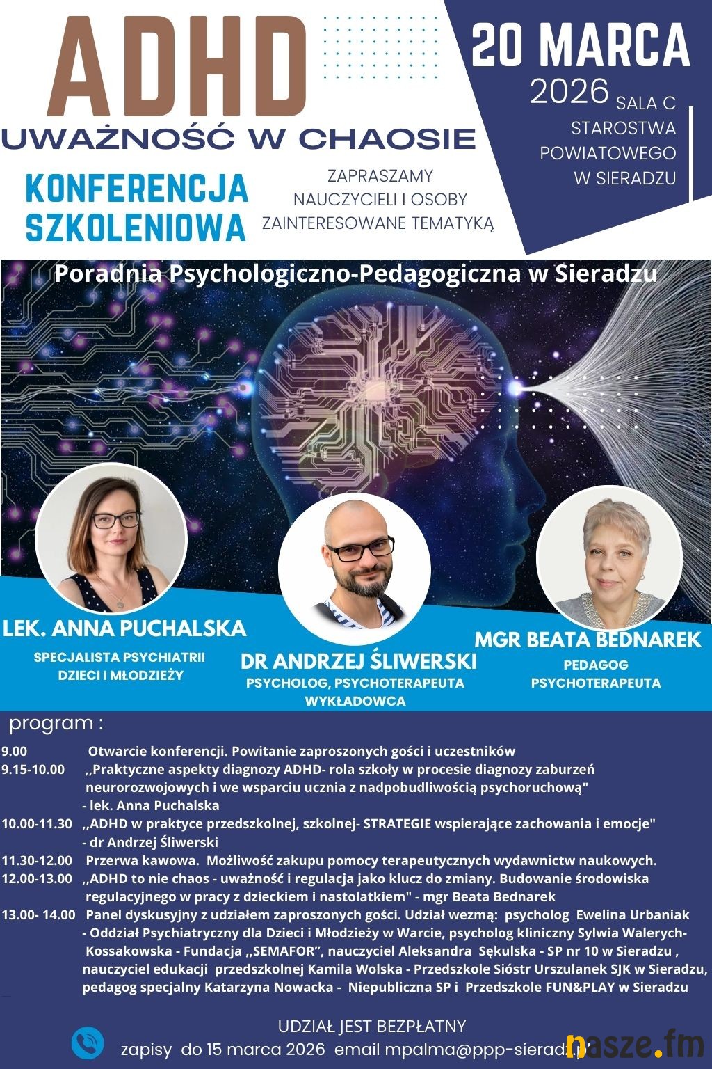 W przyszłym tygodniu w Sieradzu odbędzie się konferencja szkoleniowa pt. "ADHD - Uważność w chaosie. Praktyka kliniczna i edukacyjna". Do udziału w wydarzeniu zaprasza Poradnia Psychologiczno-Pedagogiczna w Sieradzu.