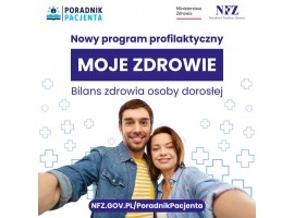 Moje Zdrowie to kompleksowy przegląd zdrowotny dorosłego. Kilkanaście bezpłatnych badań laboratoryjnych, indywidualny plan zdrowotny z oceną stanu zdrowia i ocena ryzyka chorób cywilizacyjnych dostępne są dla każdego u swojego lekarza POZ.