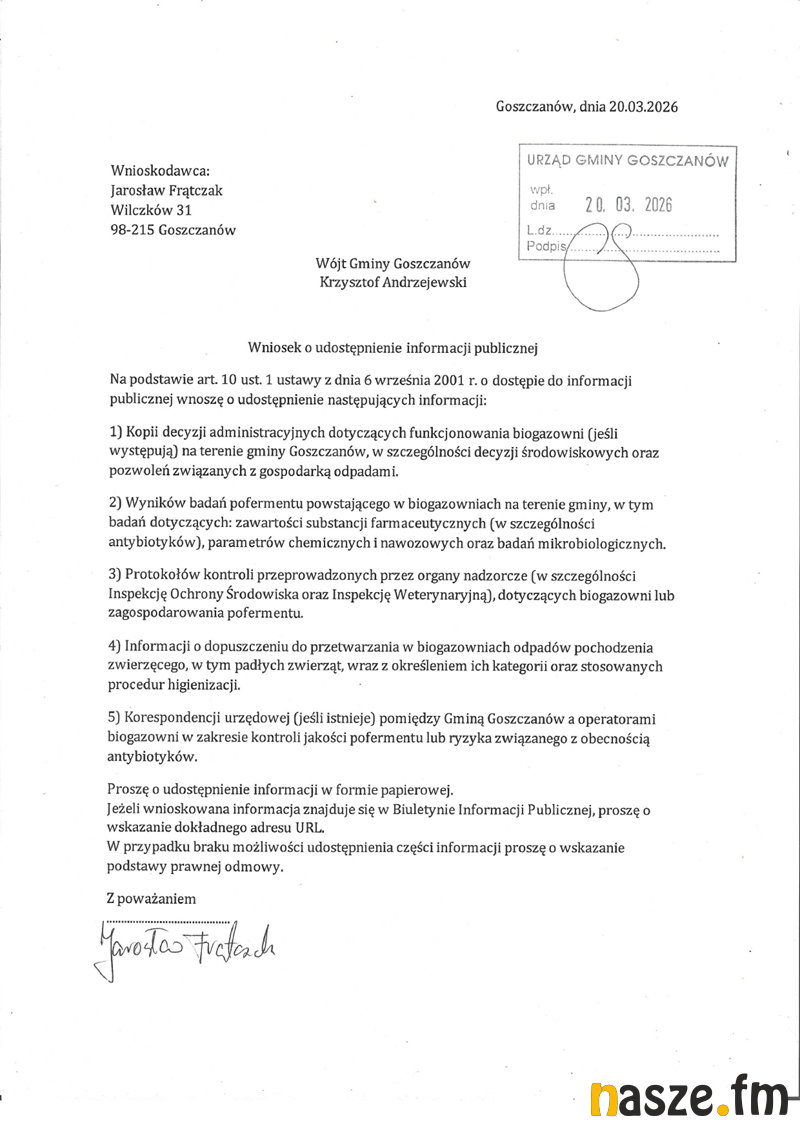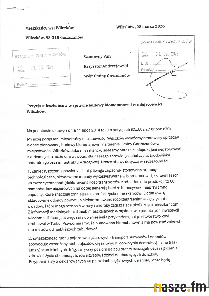 Dzień dobry chciałem zapytać o możliwość podjęcia tematu przez Nasze Radio planowanej inwestycji budowy dużej biometanowni we wsi Wilczków gmina Goszczanów. Planowana jest inwestycja na którą my mieszkańcy wsi Wilczków i okolic się nie zgadzamy. Sama inwestycja budzi nasz sprzeciw ze względu na ogromne natężenie ruchu samochodów ciężarowych z substratem i padliną zwierzęcą która jak można się domyśleć będzie emitowała ogromny fetor na dużą odległość planowany przerób roczny to około 150 tysięcy ton, do naszej wsi prowadzą drogi które są w złym stanie a powstanie tak duże natężenie samochodów ciężarowych, że problemem będzie wyjazd z posesji dla nas i każdego rolnika chcącego dojechać do pola ciągnikiem, takie natężenie ruchu całkowicie uniemożliwi poruszanie się pieszo, oraz osobom na wózkach inwalidzkich i osobom niepełnosprawnym które są mieszkańcami naszej wsi. Gmina wysłała wniosek o decyzji środowiskowych 17 grudnia 2025 roku czyli jeszcze nie jest za późno, żeby interweniować. Problemem przy budowie tej biometanowni jest fakt, że planami inwestycji zajmuje się Spółka z.o.o we Wrocławiu która po pozytywnym załatwieniu wszelkich formalności może odsprzedać projekt komu zechce. W razie jakiejkolwiek dużej awarii lub skażenia terenu taka spółka zawinie się stąd przykładem mogą posłużyć nielegalne wysypiska śmieci w Polsce gdzie wszyscy się domyślamy co się z tym dzieję i jak się to kończy. Liczymy na waszą pomoc gdyż chcemy jeszcze mieszkać w pięknej zielonej okolicy w pobliżu znajduje się obszar NATURA 2000 jest tu dużo dzikiej zwierzyny i ptactwa które są pod ochroną. Czekamy z niecierpliwością na pozytywne rozpatrzenie naszego maila i odpowiedź.