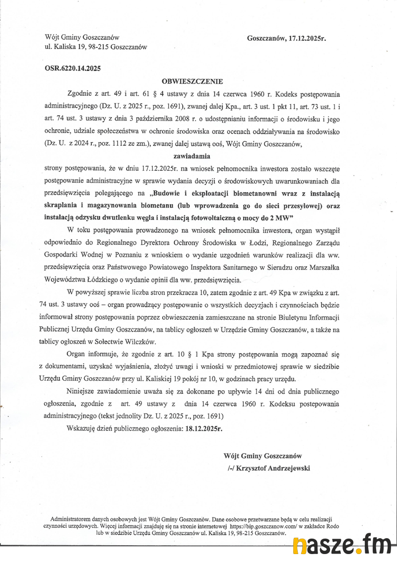 O komentarz do tej sprawy poprosiliśmy wójta Goszczanowa. Samorządowiec podkreśla, że ta jest dopiero w początkowej fazie, a budowa biometanowni wcale nie jest przesądzona.