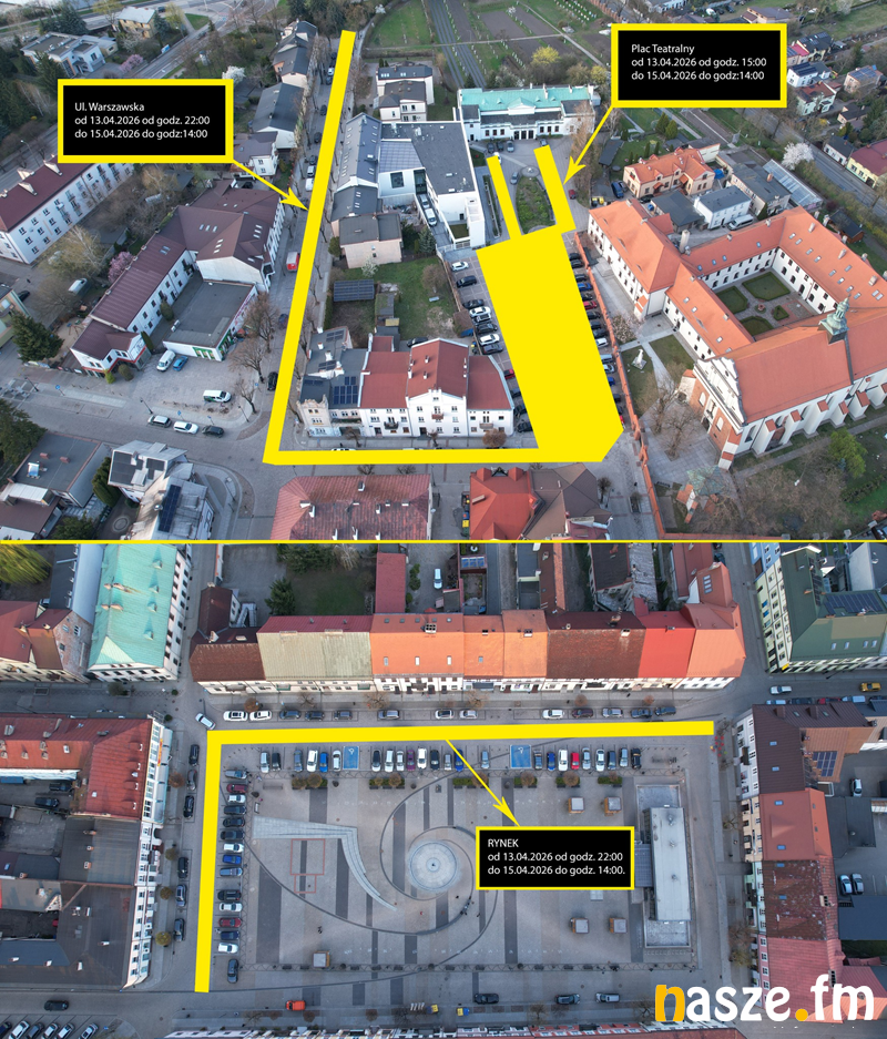 13 kwietnia 2026 od godz. 22.00 do 15 kwietnia do godz. 14.00 z tym, że parking przy Teatrze Miejskim wyłączony zostanie od 13 kwietnia 2026 od godz. 15.00 do 15 kwietnia 2026 do godz. 14.00. W tym czasie korzystanie z parkingu nie będzie możliwe. Organizatorzy proszą o usunięcie pojazdów przed wskazanym terminem oraz skorzystanie z alternatywnych miejsc postojowych.