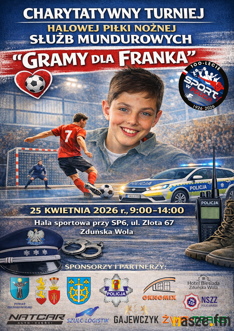 Pomóżmy Frankowi w walce o zdrowie. Policja zaprasza w sobotę, 25 kwietnia, do hali sportowej w Szkole Podstawowej numer 6 ulica Złota 67 w Zduńskiej Woli.Początek rozgrywek o godz. 9:00. Wstęp wolny.