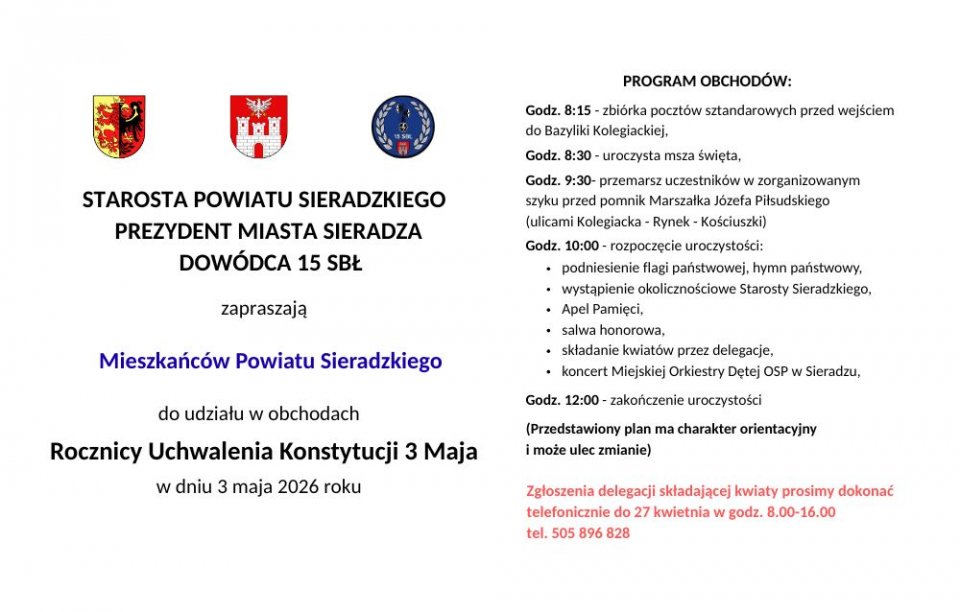 Hufiec ZHP Sieradz, 15. Sieradzka Brygada Łączności oraz Urząd Miasta Sieradza zapraszają o godz. 11:00 na plac przy pomniku Marszałka Józefa Piłsudskiego. Wspólnie z mieszkańcami Sieradza rozciągnięta będzie 20-metrowa flaga w barwach narodowych oraz odśpiewany hymn państwowy.