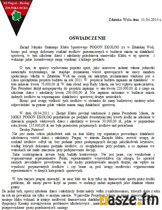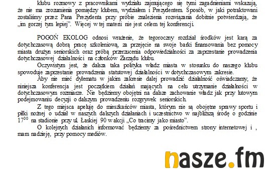 Oświadczenie MGKS Pogoń Ekolog Zduńska Wola: