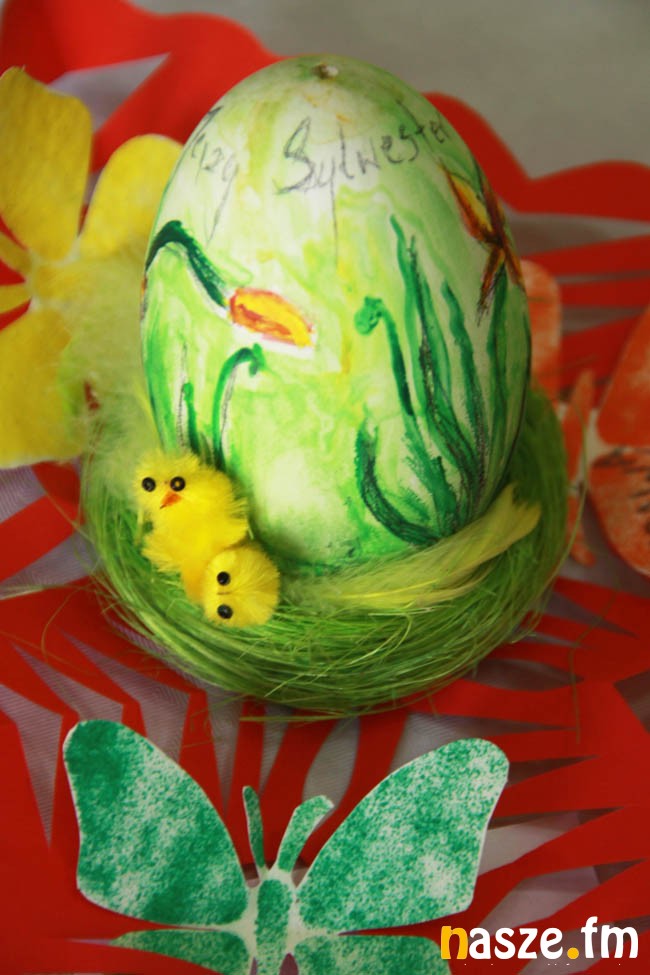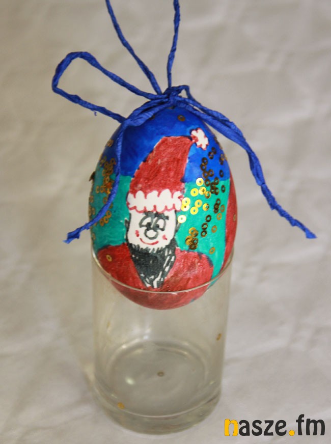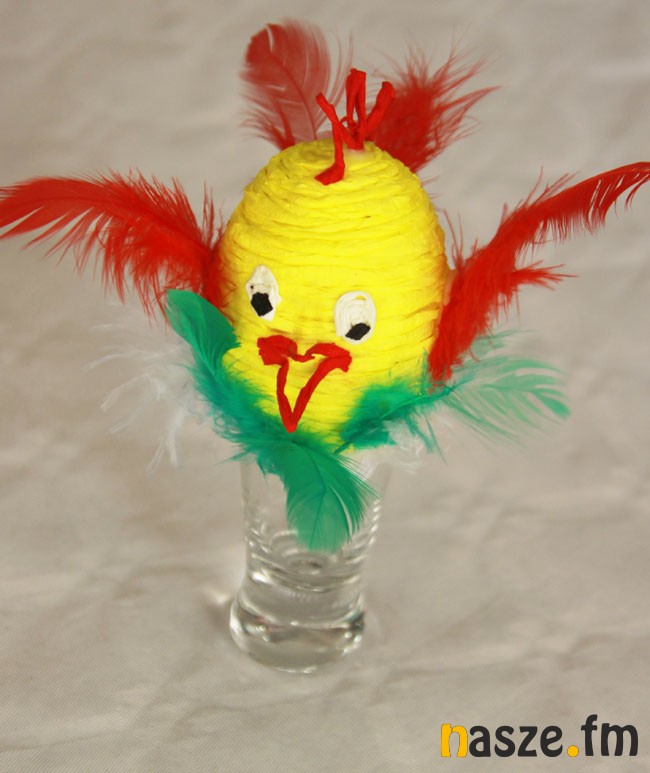 - Moje jajko przedstawia kurczaka wielkanocnego. Jest obklejony bibułą i ma wszystkie elementy, które ma kurczak - czyli skrzydła, ogonek, grzebień i dziób. W miarę szybko i sprawnie mi to poszło.