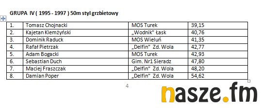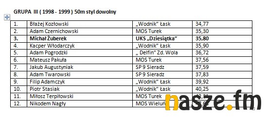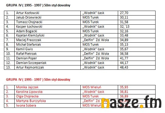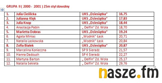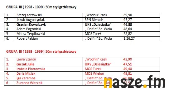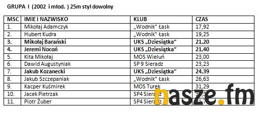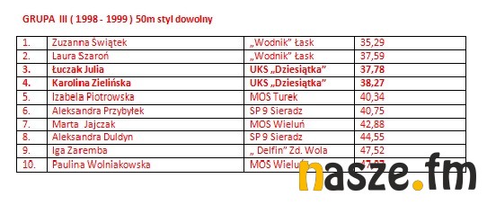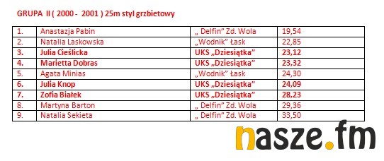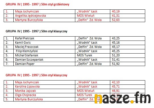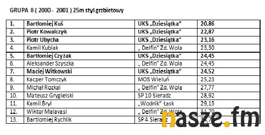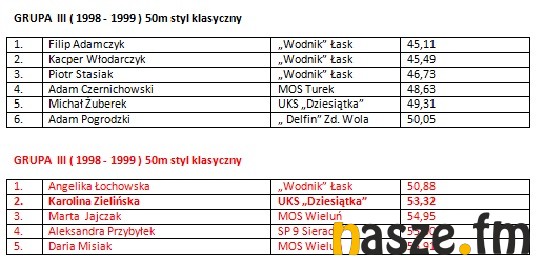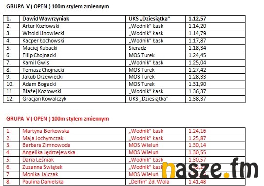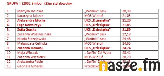 W imprezie wzięli udział pływacy z Łasku, Sieradza, Wielunia, Turku i Zduńskiej Woli. Poniżej wyniki poszczególnych kategorii.