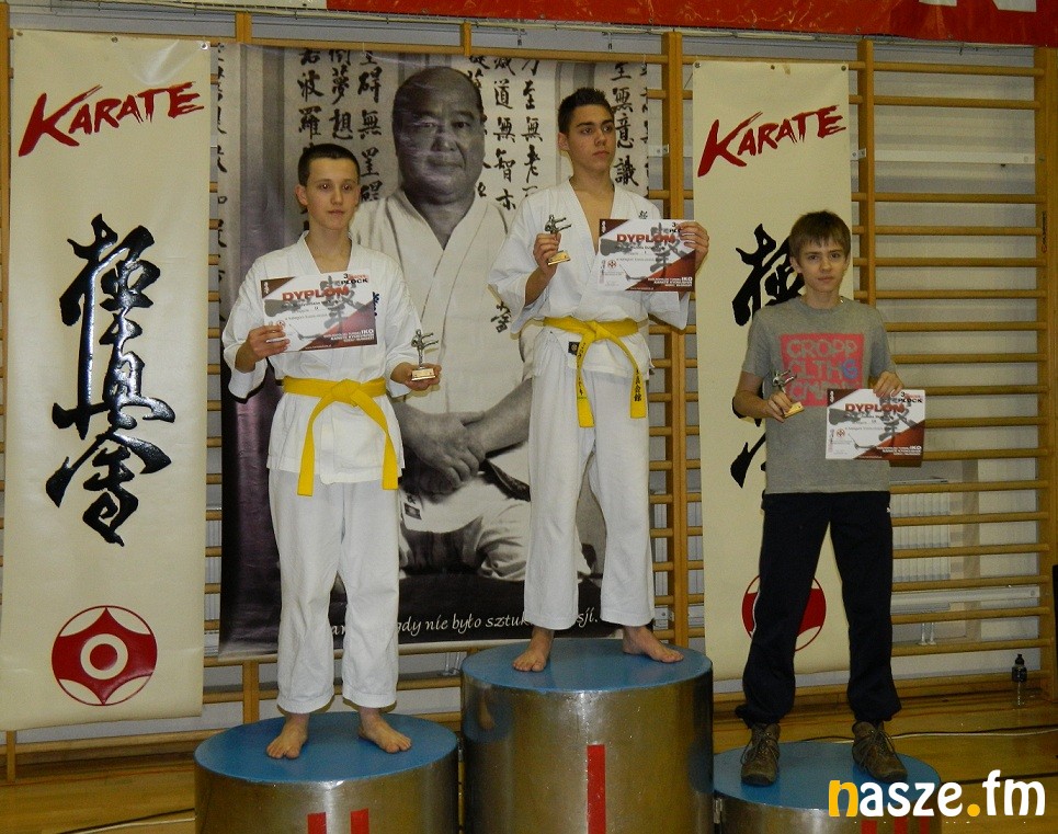 Na najwyższym stopniu podium stanęli podopieczni Marka Urbańskiego (na zdjęciu w środku), który w Płocku wystąpił w podwójnej roli, trenera i sędziego. W kumite (semi kontakt) wygrał Michał Ochocki (pierwszy z lewej), natomiast w kata chłopców bezkonkurencyjny okazał się Jakub Kaczmarek (pierwszy z prawej). Gratulujemy!