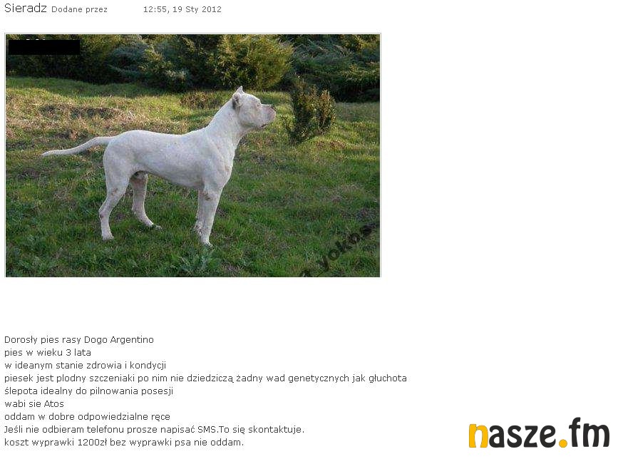 Niestety mimo jasno określonych zasad sprzedawcy wciąż szukają nowych sposobów na to, żeby zwierzę sprzedać, a nie oddać zupełnie za darmo. Również w naszym regionie można spotkać podobne oferty. Jeszcze do niedawna w Sieradzu można było przygarnąć trzyletniego doga argentyńskiego. W ogłoszeniu mogliśmy przeczytać, że taki pies do nas trafi pod warunkiem, że zapłacimy za wyprawkę - a to już "jedyne" 1200 zł.