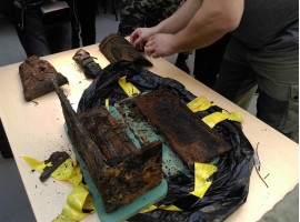 W sobotę się nie udało - udało się za to dziś. W polu pod Wrzącą (gm. Błaszki) pasjonaci historii wydobyli z ziemi drewnianą skrzynkę, w której 76 lat temu schowano osobistą broń, mapnik i pas polskiego pilota podporucznika Pawła Łuczyńskkiego.