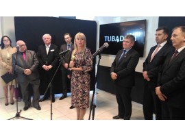 Unijna komisarz Elżbieta Bieńkowska ze statuetką Ambasadora Polskiego Biznesu. Wyróżnienie przyznane przez Polski Klub Biznesu wręczono oficjalnie na dzisiejszym spotkaniu w Centrum Logistycznym Ceramiki Tubądzin w Cedrowicach koło Ozorkowa.