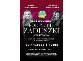 Stowarzyszenie Carpe Diem po Charłupsku zaprasza 9 listopada na VIII edycję Poetyckich Zaduszek w hali sportowo widowiskowej przy Szkole Podstawowej w Charłupi Małej. Koncert Galowy jak zawsze składa się z dwóch części. W pierwszej występuje utalentowana młodzież regionu sieradzkiego. W tym roku wystąpi Tymon Kubiczak uczeń Szkoły Podstawowej w Jakubicach. W drugiej znani artyści polskiej sceny muzycznej. Tym razem na scenie dwie Wokalistki: Monika Kuszyńska i Anna Jurksztowicz.