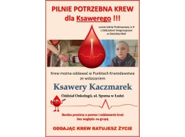 Ksawery Kaczmarek, uczeń klasy V c Szkoły Podstawowej nr 9 z Oddziałami Integracyjnymi w Zduńskiej Woli choruje na ostrą białaczkę limfoblastyczną. Obecnie przebywa na oddziale onkologicznym przy ul. Spornej w Łodzi, gdzie poddawany jest chemioterapii. Choroba niestety postępuje, potrzebna jest duża ilość krwi oraz znalezienie jego bliźniaka genetycznego do przeszczepu szpiku lub komórek macierzystych.