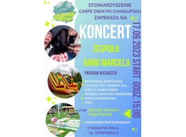 17 września w Charłupi Małej odbędzie się koncert zespołu Gang Marcela. Do tego będą animacje i atrakcje dla dzieci a także występy regionalnych artystów. Wydarzenie organizuje Stowarzyszenie Carpe Diem po Charłupsku.