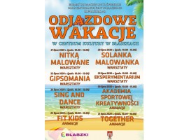 Centrum Kultury w Błaszkach zaprasza na "Odjazdowe wakacje". W programie warsztaty artystyczne, taneczne czy sportowe. Zajęcia potrwają do 31 lipca. Szczegóły na plakacie.