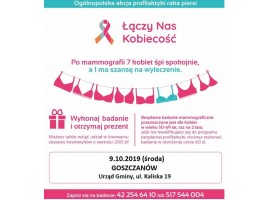 Dziś w Goszczanowie będzie można wykonać bezpłatne badania. To w ramach Ogólnopolskiej Akcji Profilaktyki Raka Piersi. Program skierowany jest do kobiet w wieku od 50 do 69 roku życia, które w ciągu ostatnich 2 lat nie korzystały z bezpłatnej mammografii.