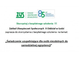Zakład Ubezpieczeń Społecznych II Oddział w Łodzi zaprasza na bezpłatne szkolenia na temat: Świadczenie uzupełniające dla osób niezdolnych do samodzielnej egzystencji. Szkolenia odbędą się 23 września w Sieradzu a 25 w Zduńskiej Woli.