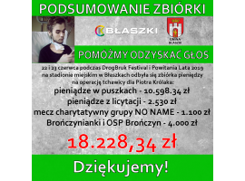 W miniony weekend w Błaszkach zostały zorganizowane dwie impezy plenerowe na przywitanie lata. Poza dobrą zabawą celem wydarzeń była też pomoc Piotrowi Królakowi, mieszkańcowi Błaszek, który znalazł się w trudnej sytuacji zdrowotnej i potrzebuje wsparcia. Podczas licytacji, zbiórek i aktywności charytatywnej mieszkańców zebrano 18.228,34 złotych.