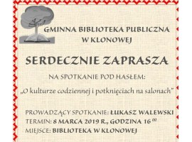 Gminna Biblioteka Publiczna w Klonowej zaprasza 8 marca na spotkanie pod hasłem: "O kulturze codziennej i potknięciach na salonach". Prowadzącym będzie dziennikarz Łukasz Walewski.