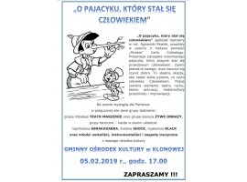 Gminny Ośrodek Kultury w Klonowej zaprasza 5 lutego na spektakl teatralny "O pajacyku, który stał się człowiekiem". Na scenie wystąpią grupy teatralne, taneczne, wokaliści, instrumentaliści i zespoły muzyczne.