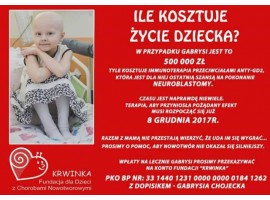 Gabrysia Chojecka mieszka w Orzeżynie (gm. Błaszki) ma 8 lat i choruje na neuroblastomę, to nowotwór złośliwy układu nerwowego. Dziewczynka ma szansę na powrót do zdrowia, ale potrzeba jeszcze 500 tys. zł, żeby mogła rozpocząć specjalistyczne leczenie. Kwota musi zostać zebrana do 8 grudnia.