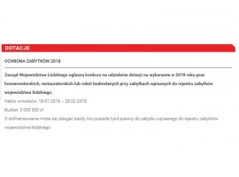Zarząd Województwa Łódzkiego ogłosił konkurs na udzielenie dotacji na wykonanie w 2018 roku prac konserwatorskich, restauratorskich lub robót budowlanych przy zabytkach wpisanych do rejestru zabytków województwa łódzkiego. Przeznaczono na to kwotę 5 milionów złotych.