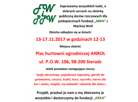 Od 13 do 17 listopada będzie trwała zbiórka darów rzeczowych dla podopiecznych z fundacji Arka z Męckiej Woli, którą organizuje Fundacja Wspierania Polskiej Wsi z Sieradza.