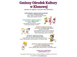 Gminny Ośrodek Kultury w Klonowej zaprasza chętne dzieci do udziału w dodatkowych zajęciach indywidualnych i grupowych.